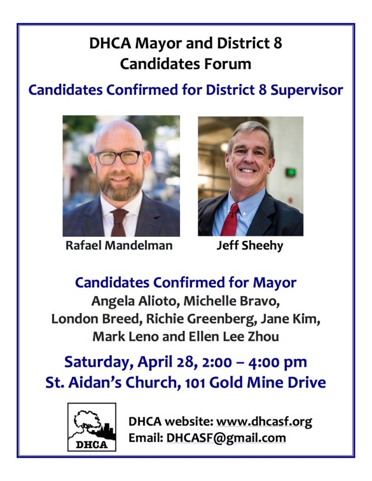 The Diamond Heights Community Association is delighted to invite the public to its Candidates for Mayor and District 8 Supervisor Forum on Saturday, April 28, 2:00 to 4:00 pm at St. Aidan’s Church. Candidates for Mayor that have confirmed attendance are Angela Alioto, Michelle Bravo, London Breed, Richie Greenberg, Jane Kim, Mark Leno and Ellen Lee Zhou. Candidates for District 8 that have confirmed attendance are Rafael Mandelman and Jeff Sheehy. The election for Mayor and District 8 Supervisor is scheduled for June 5, 2018.