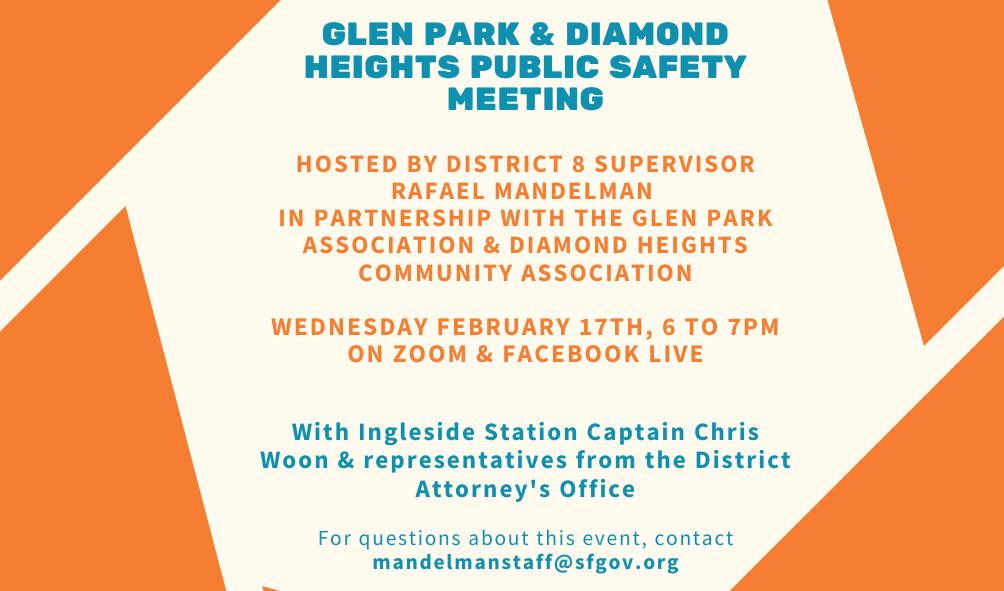 Due to recent incidents of gunfire on the streets of our neighborhoods, Supervisor Mandelman has scheduled this opportunity to discuss public safety with Capt. Chris Woon, SFPD Ingleside Station, and Brian Bringardner, DA Liaison to Glen Park.