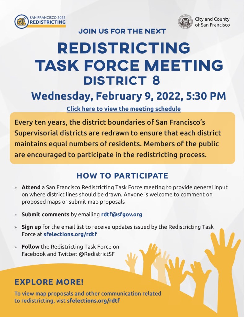 District 8 will be the topic of the virtual meeting of the San Francisco Redistricting Task Force on Feb 9 at 5:30 pm. The meeting link is not yet posted. Please check for a DHCA Announcement a couple of days before Feb. 9 to access the meeting link. A flyer for the meeting is included below.