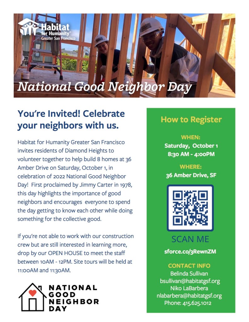 “Come celebrate National Good Neighbor Day with Habitat for Humanity Greater San Francisco on Saturday, October 1 and help build 8 affordable homes at 36 Amber Drive! Exclusively reserved for residents of Diamond Heights and nearby neighbors. This 8:30AM – 4:00PM shift will be a great opportunity to get to know your neighbors and work alongside them on a project that lifts up the entire community. Sign up: sforce.co/3RewnZM early as spots are limited. If you have questions, please call 415.625.1012. Please join us!”