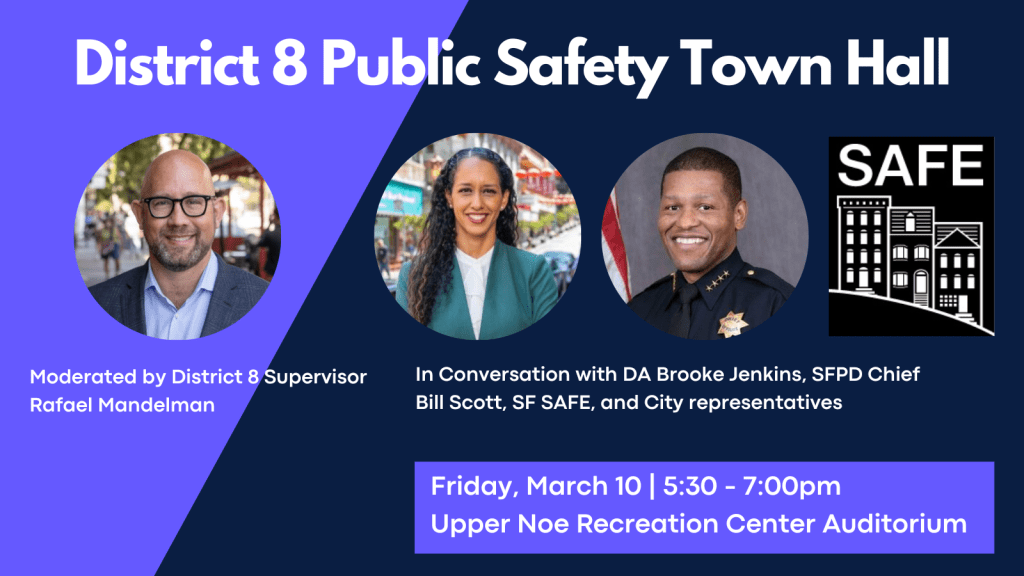 Join me next Friday, March 10, for a District 8 Public Safety Town Hall with DA Brooke Jenkins, SFPD Chief Bill Scott, SF SAFE, and other representatives from your City government.
