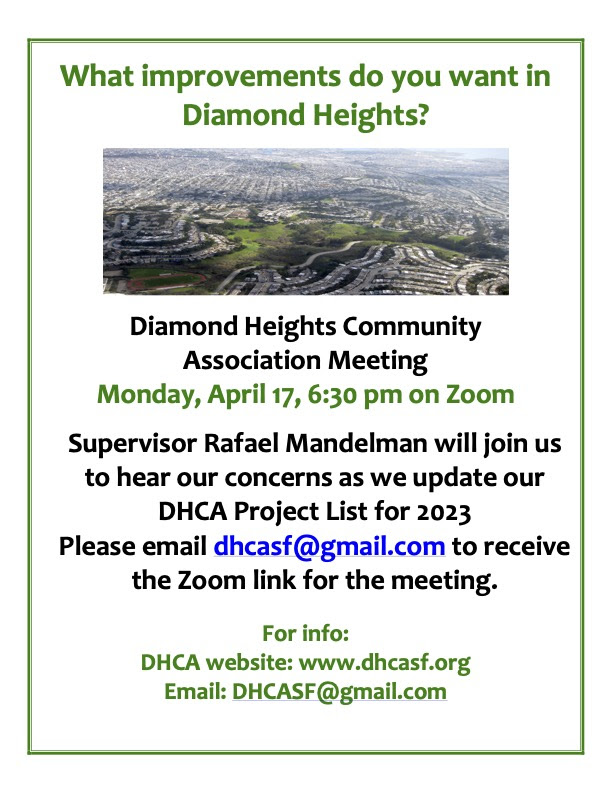 Supervisor Rafael Mandelman will be joining us to discuss improvements for Diamond Heights, the DHCA Accomplishments for 2022 and volunteer needs to increase the impact of our Association.