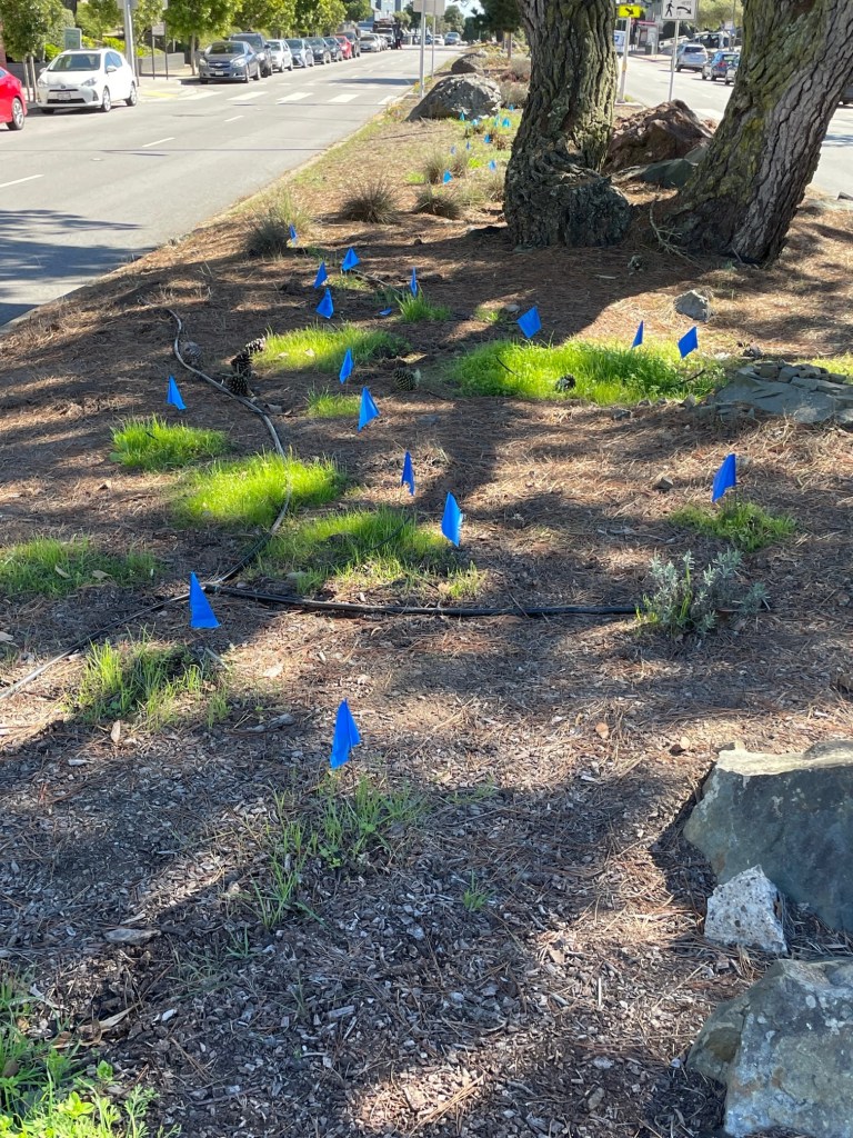 Irrigation System – We are excited to report that after three dry seasons, the median irrigation system has been repaired and refurbished. We’ve conducted an inventory of plants lost to drought and the broken irrigation system. Those flags you’ve seen in the median mark the locations where replacement plants are needed.