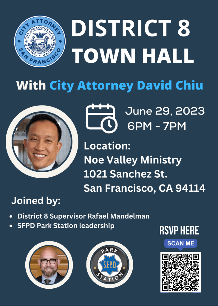 My name is Kenneth Chen with City Attorney David Chiu’s office. I am writing to share information about a town hall City Attorney Chiu is hosting on Thursday 6/29 at Noe Valley Ministry (1021 Sanchez St, San Francisco, CA 94114) at 6-7pm. During the town hall, City Attorney Chiu will discuss the role and the work of the City Attorney’s Office, including ongoing efforts to tackle public nuisances and code violations in our neighborhoods, ensure accountability, public integrity & civil law enforcement, and champion workers, consumers, environmental justice, reproductive & civil rights. District 8 Supervisor Rafael Mandelman and SFPD Park Station leadership will also be in attendance to provide district updates and answer questions from the audience.