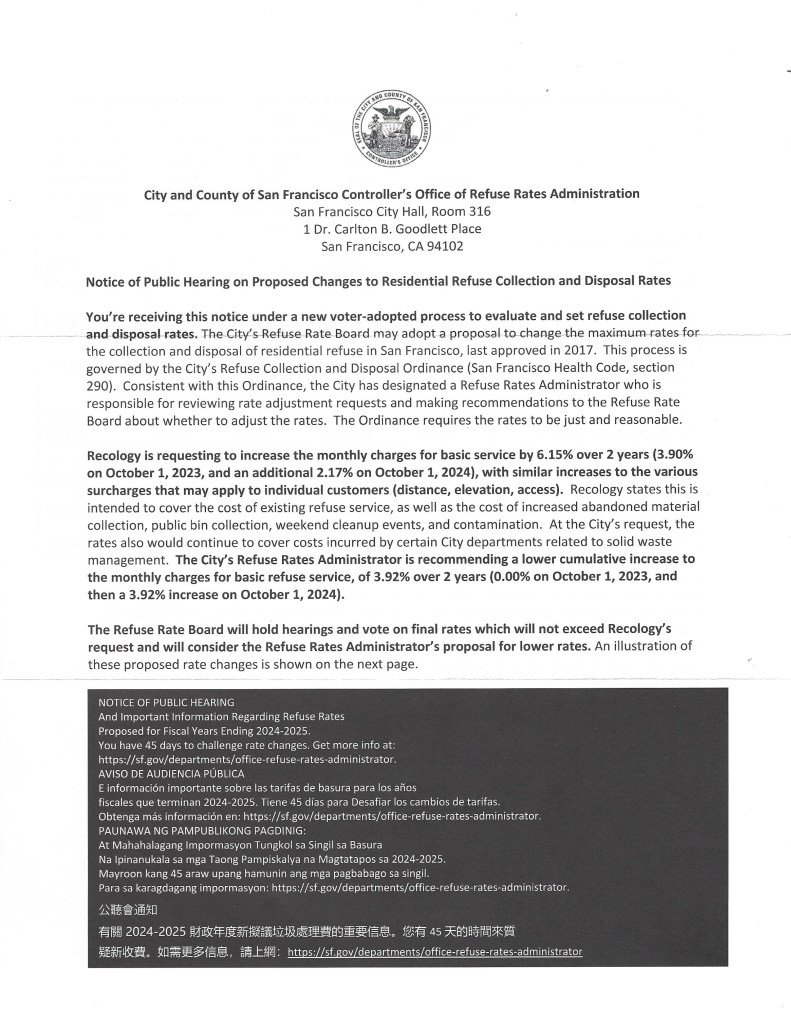 The rate increase requested by Recology for picking up residential trash bins has been under review for several months. There is still time to comment pro or con on the rate increase. The information below provides information on the rate increase, the process and the address to provide written letters of comment.