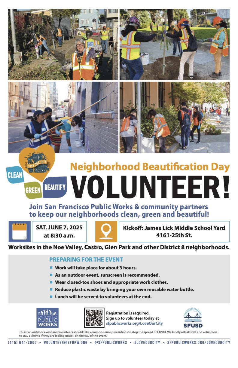 Sign up with QR code on attached flyer below or go to sfpublicworks.org/LoveOurCity Sign up for Heights/Heights/Glen Park on June 7