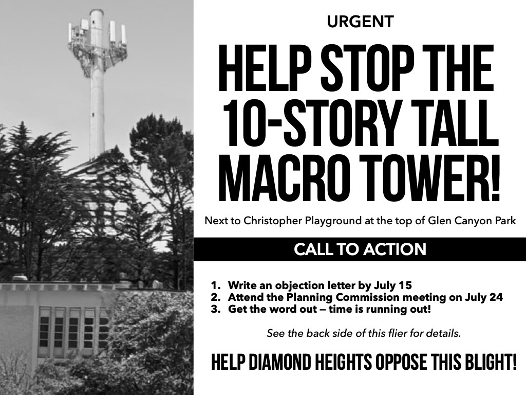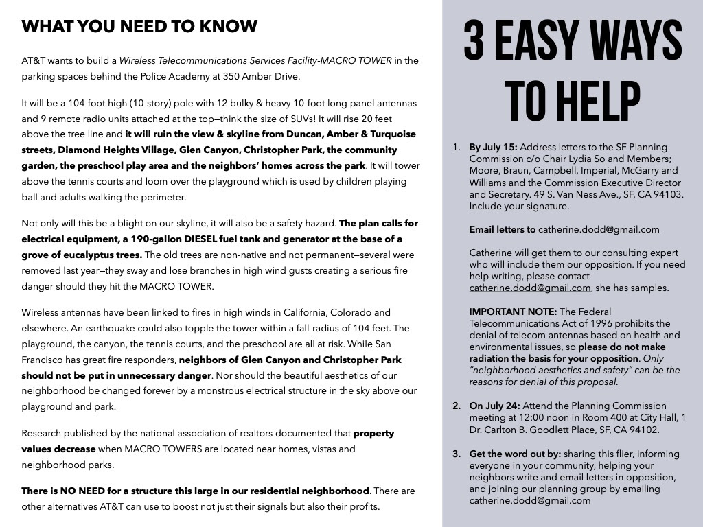 Though there is support for the AT&T Macro Tower due to dead zones for wireless coverage, there is also opposition. The majority of the DHCA Board members voted to oppose the installation. The flyer attached below provides reasons for opposition and how to take action to have a balanced conversation about the suitability of placing a 10-Story Macro Tower, 12 antennas, 9 radio receivers, a 190 gallon diesel storage tank and generator in back of Police Academy next to Christopher Park and Glen Canyon Park.
